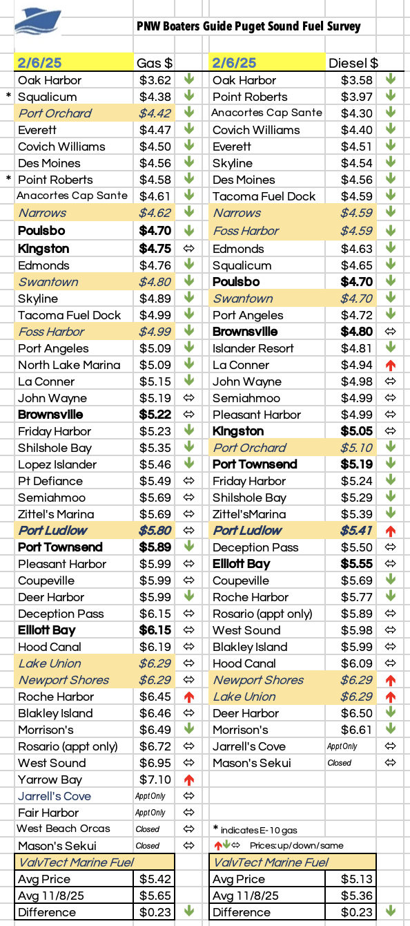 It's the first Puget Sound Fuel Survey of 2026! (Scroll down for survey.) Fuel surveys will be published once a month until spring, when we will be back to surveys on the first and 15th of each month. As always, we have attempted to be as accurate as possible. We use multiple sources to gather prices, including talking directly with fuel docks, gathering published prices on their websites, and the free Fuel Docks app (link at bottom). But the best source is you! If you see a different price at the pump, please let us know. We'll make corrections and repost the survey here on the app. Please remember prices can change at any time, so we always recommend calling ahead to confirm the price of fuel before you arrive.