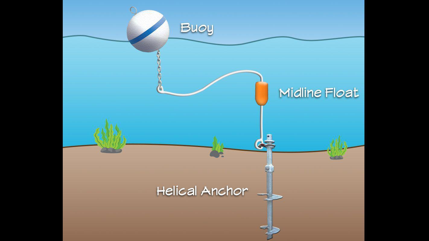 WA State Parks has completed the San Juan Islands buoy maintenance project, part of a 5-year initiative to repair or replace 259 mooring buoy in the greater Salish Sea. The work involves installing modern, eco-friendly helical anchors (see diagram below) and replacing old buoy gear to ensure boater safety and protect eel grass.