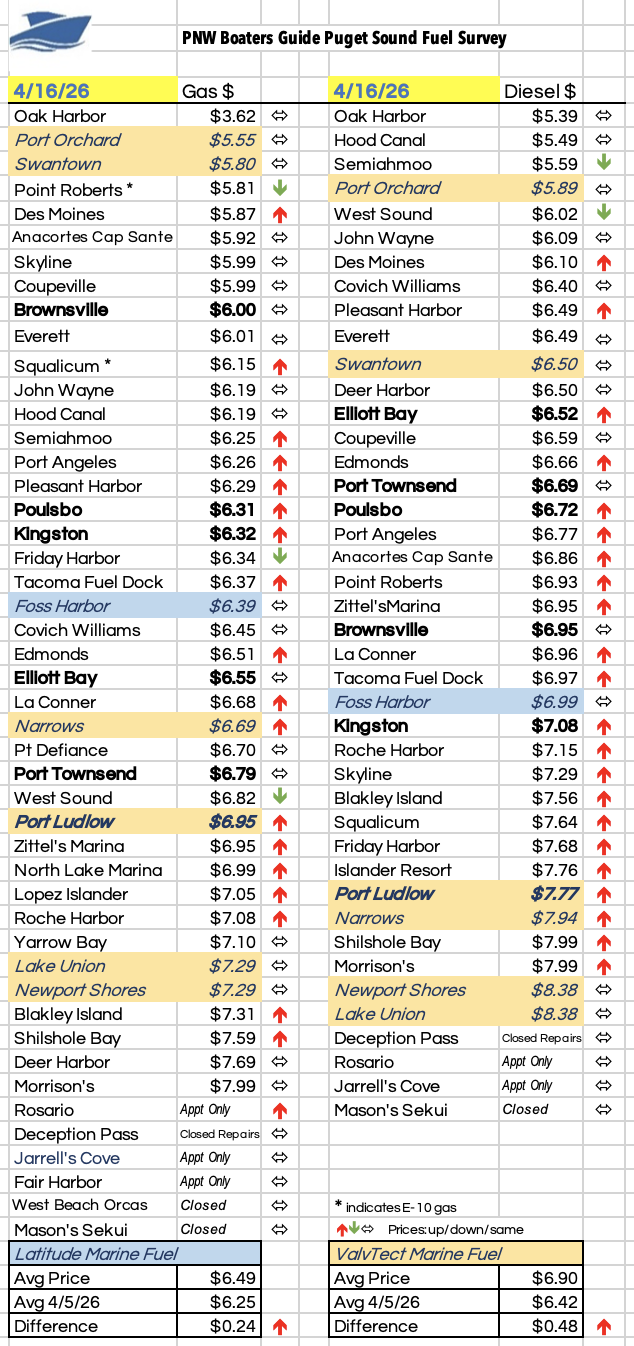 After the shocking price hikes in the first April Puget Sound Fuel Survey, this mid-month survey still went up, thankfully a bit less (scroll down for survey)! Fuel surveys will be released the first and 15th of each month through the boating season. As always, we have attempted to be as accurate as possible. We use multiple sources to gather prices, including talking directly with fuel docks, gathering published prices on their websites, and the free Fuel Docks app (link at bottom). But the best source is you! If you see a different price at the pump, please let us know. We'll make corrections and repost the survey here on the app. Please remember prices can change at any time, so we always recommend calling ahead to confirm the price of fuel before you arrive - ESPECIALLY WITH THE CURRENT HIGH PRICES!